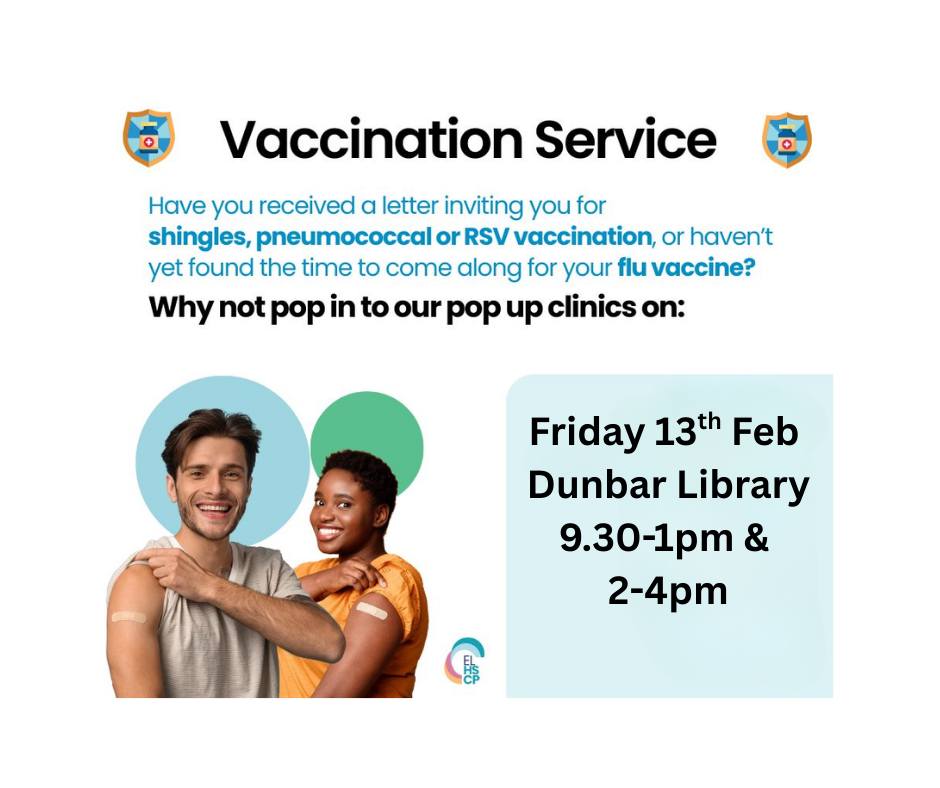Come along to the Adult vaccination drop in session at Dunbar Library on Friday 13th February. If you have had your letter for Flu, Shingles, Pneumococcal and RSV vaccination but haven't had time to go elsewhere , pop along and see the team