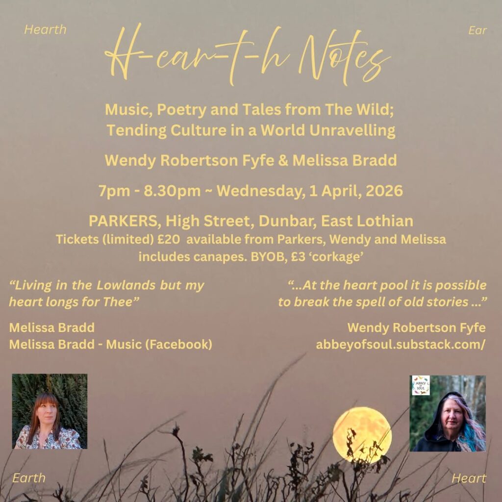 We are delighted to announce H-ear-t-h Notes, Music, Poetry and Tales from the Wild; Tending Culture in a World Unravelling. This is a one and half hour feast of deep nourishing notes to feed these challenging times rippling a spear of ancient and cutting-edge artistry your way, to the many in one.