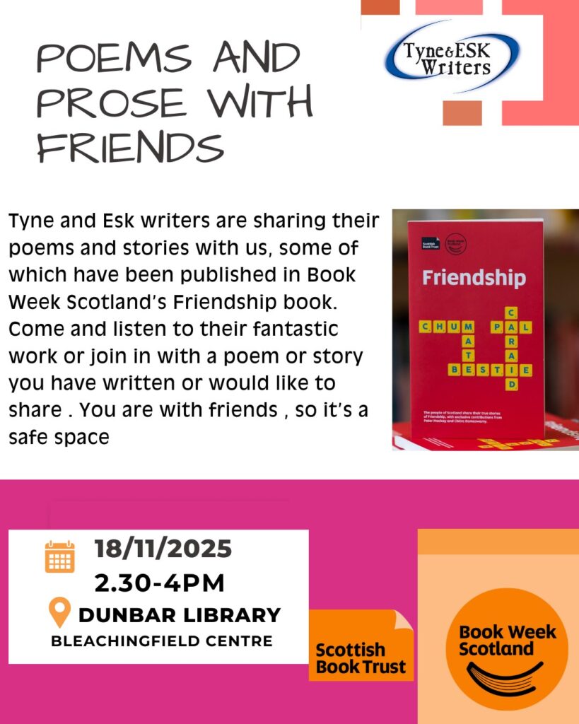 Dunbar Library is lucky to have the Tyne and Esk writes join us for an afternoon poetry event on Tuesday 18th November. Come and listen to some amazing poetry. You are welcome to join in with anything you have written or with something you would just like to share.