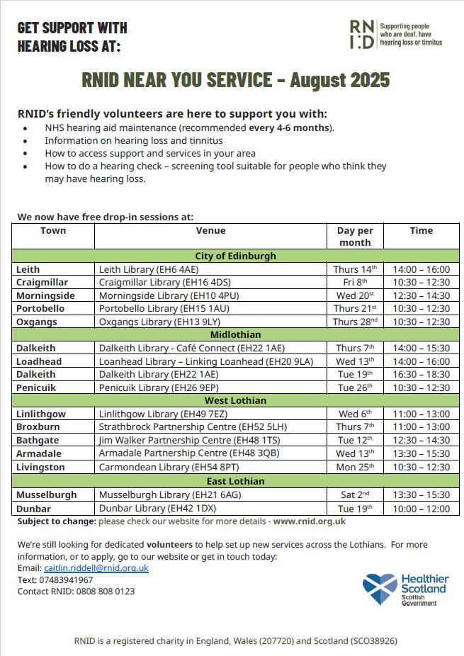Did you know RNID have services all over Edinburgh/ Lothians each month supporting people who are deaf, have hearing loss and/or suffer with tinnitus? They provide free hearing aid maintenance for NHS aids which is recommended every 4-6 months. They can provide a hearing test to people who are currently not yet at audiology.They also provide support and information
