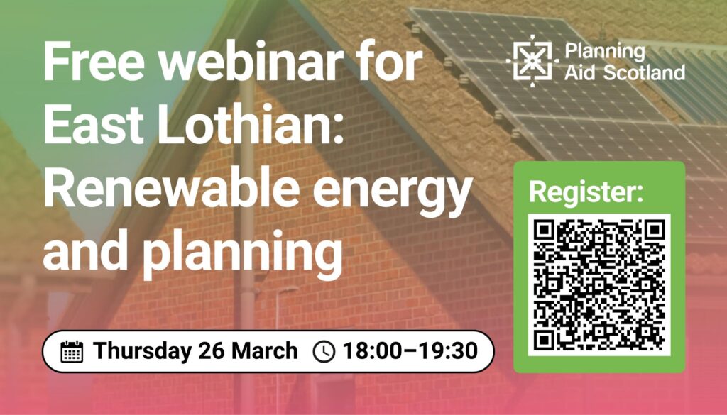 Organised by Planning Aid Scotland. Learn how decisions about renewable energy projects are made in Scotland, and how the planning and consent process works.