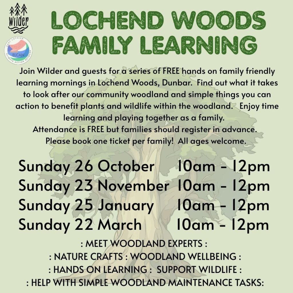 - Join Wilder for a series of fun and informative family learning sessions between October and March. These sessions are kindly funded by East Lothian Climate Action Network (https://eastlothianclimatehub.org/) to support community engagement with Lochend Woods and the work of Dunbar Community Woodland group. Meet at Lochend Community Woodland EH42 1XB)